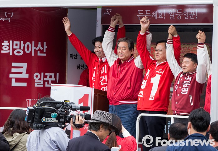 (아산=포커스뉴스) 6일 오후 충남 아산 충무로에서 이명수 새누리당 아산시갑 후보 지원유세에 나선 김무성 대표가 유권자들에게 지지를 호소하고 있다.