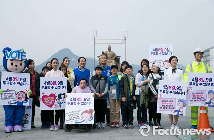 (서울=포커스뉴스) 김종인 더불어민주당 비대위 대표 겸 선대위원장이 6일 오후 서울 광화문광장에서 정세균 종로구 후보, 비례대표 후보, 창원 봉강초등학교 학생들과 20대 총선 사전투표 캠페인을 하고 있다.