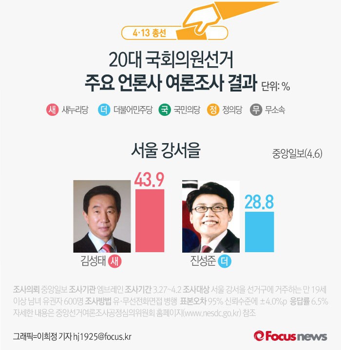 (서울=포커스뉴스) 중앙일보가 엠브레인에 의뢰해 6일 발표한 서울 강서을 여론조사 결과에 따르면