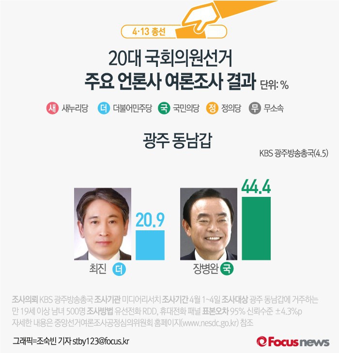 (서울=포커스뉴스) KBS 광주방송총국이 미디어리서치에 의뢰해 5일 발표한 결과에 따르면 광주 동남갑에서 더민주 최진 후보의 지지율은 20.9%, 국민의당 장병완 후보의 지지율은 44.4%인 것으로 나타났다.