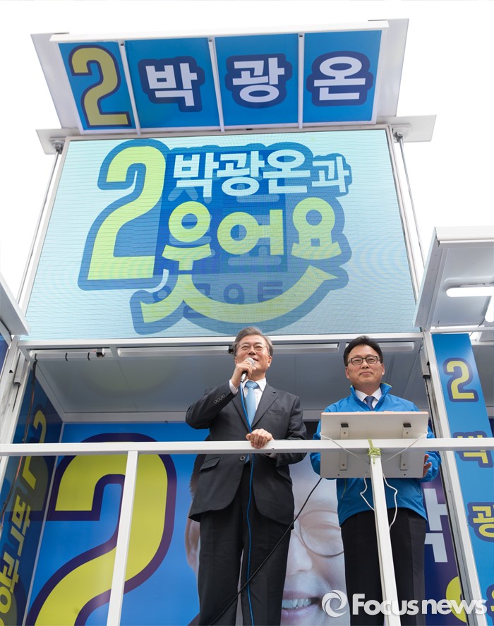 (수원=포커스뉴스) 6일 오후 경기 수원시 영통구 매탄1동 주민센터 앞에서 문재인 더불어민주당 전 대표가 박광온 더민주 수원시정 후보 지원유세를 하고 있다.