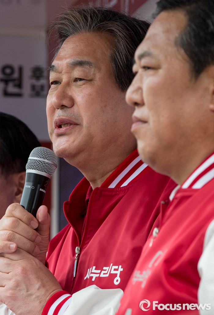 (천안=포커스뉴스) 6일 오후 충남 천안 두정로에서 최민기 새누리당 천안시을 후보 지원유세에 나선 김무성 대표가 유권자들에게 지지를 호소하고 있다.
