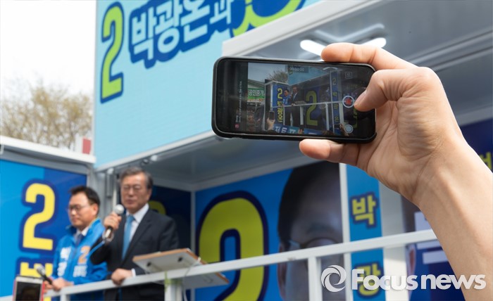 (수원=포커스뉴스) 6일 오후 경기 수원시 영통구 매탄1동 주민센터 앞에서 문재인 더불어민주당 전 대표가 박광온 더민주 수원시정 후보 지원유세를 하고 있다.