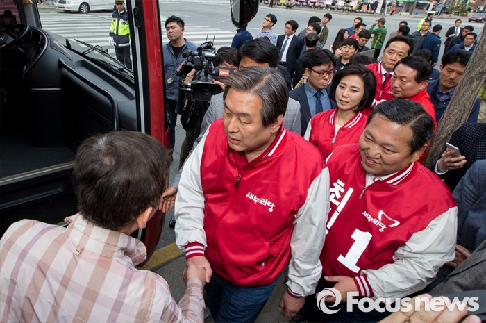 (천안=포커스뉴스) 6일 오후 충남 천안 두정로에서 최민기 새누리당 천안시을 후보 지원유세에 나선 김무성 대표가 유권자들과 악수하고 있다.