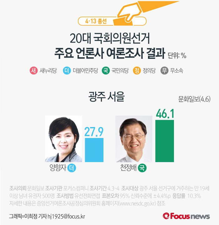 (서울=포커스뉴스) 문화일보가 포커스컴퍼니에 의뢰해 6일 발표한 광주 서을 여론조사 결과에 따르면 더불어민주당 양향자 후보의 지지율은 27.9%, 국민의당 천정배 후보는 46.1%를 기록했다.