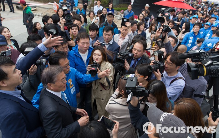 (수원=포커스뉴스) 6일 오후 경기 수원시 영통구 매탄1동 주민센터 앞에서 문재인 더불어민주당 전 대표가 박광온 더민주 수원시정 후보 지원유세를 하고 있다.
