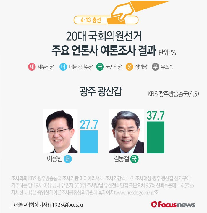 (서울=포커스뉴스) KBS 광주방송총국이 미디어리서치에 의뢰해 5일 발표한 광주 광산갑 여론조사 결과에 따르면 더불어민주당 이용빈 후보의 지지율은 27.7%, 국민의당 김동철 후보는 37.7%를 기록했다.