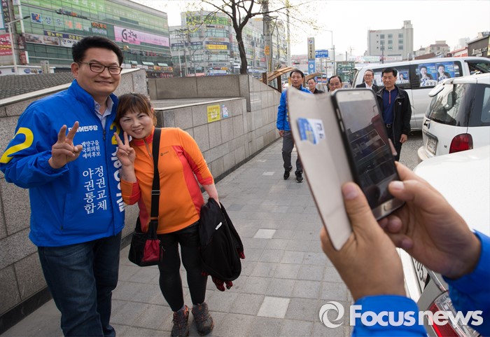 (인천=포커스뉴스) 제20대 총선에 출마한 송영길 더불어민주당 계양을 후보가 6일 오후 인천 계양구 계산역 앞에서 선거운동을 하고 있다.