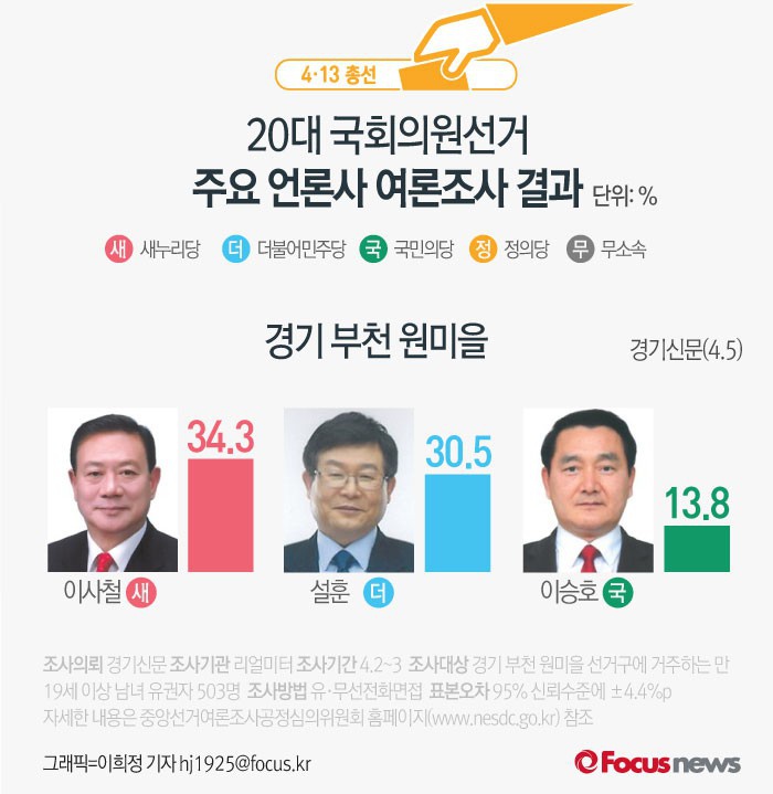 (서울=포커스뉴스) 경기신문이 리얼미터에 의뢰해 5일 발표한 경기부천 원미을에 여론조사 결과에 따르면 새누리당 이사철 후보의 지지율은 34.3%, 더불어민주당 설훈 후보의 지지율은 30.5%, 국민의당 이승호 후보는 13.8%를 기록했다.