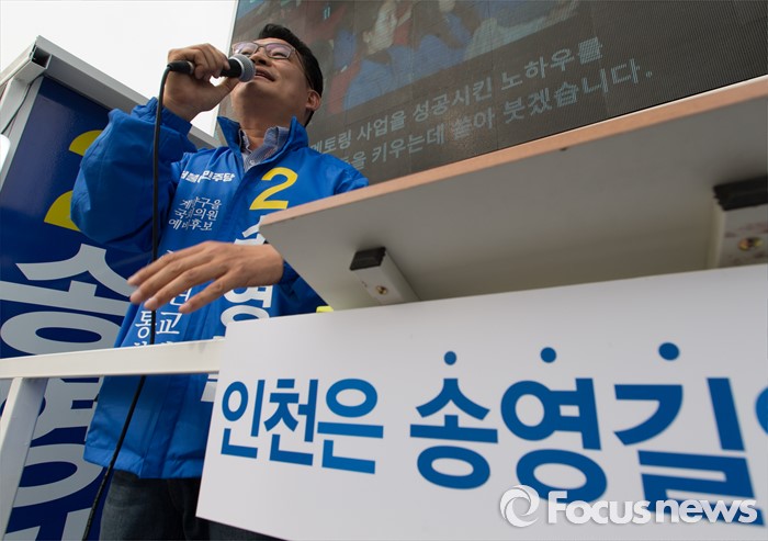 (인천=포커스뉴스) 제20대 총선에 출마한 송영길 더불어민주당 계양을 후보가 6일 오후 인천 계양구 계산역 앞에서 선거운동을 하고 있다.
