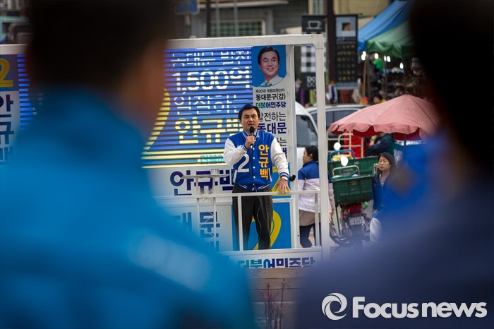 (서울=포커스뉴스) 안규백 더불어민주당 동대문구갑 후보가 6일 오후 서울 동대문구 휘경동 일대에서 유권자들에게 소중한 한 표를 호소 하고 있다.