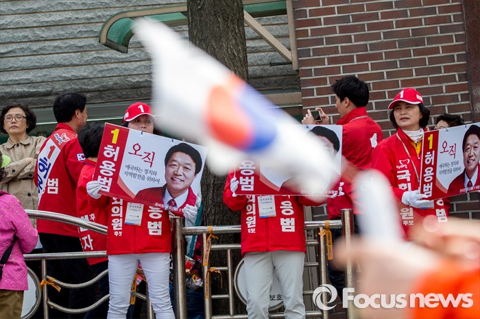(서울=포커스뉴스) 허용범 새누리당 동대문구갑 후보가 6일 오후 서울 동대문구 제기동 일대에서 유세에 앞서 유권자들에게 인사 하고 있다.