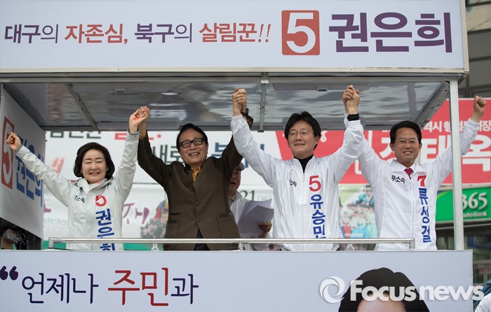 (대구=포커스뉴스) 유승민 무소속 동구을 후보를 비롯한 무소속 후보들이 6일 오후 대구광역시 북구 칠성시장 앞에서 열린 합동 유세에서 선거운동을 하고 있다. 오른쪽부터 류성걸 동구갑 후보, 유승민 동구을 후보, 박찬종 전 의원, 권은희 북구갑 후보.