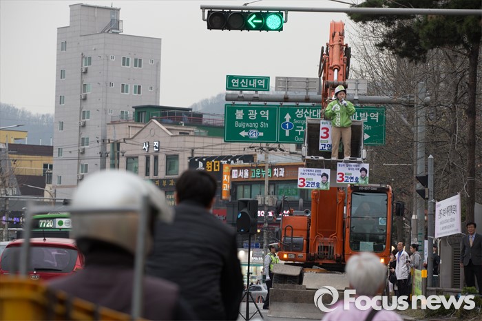 (서울=포커스뉴스) 6일 오후 서울 은평구 연신내 물빛공원에서 고연호 국민의당 은평구을 후보가 포클레인 위에서 유세를 하고 있다.