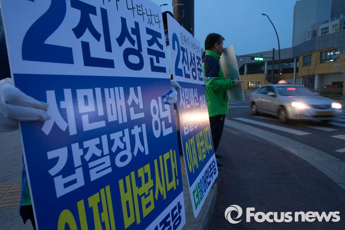 (서울=포커스뉴스) 20대 총선을 일주일 앞둔 6일 오후 서울 강서구 신방화역 인근에서 진성준 더불어민주당 강서구을 후보가 퇴근길 유세를 하고 있다.