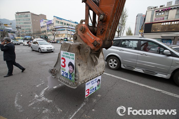 (서울=포커스뉴스) 6일 오후 서울 은평구 연신내 물빛공원에서 고연호 국민의당 은평구을 후보가 올라갈 포클레인이 대기하고 있다.