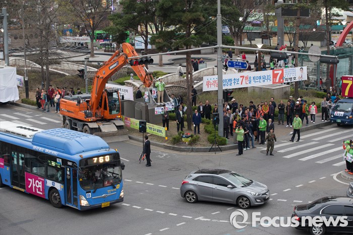 | △ 도심 속 포클레인 유세하는 고연호 후보 |