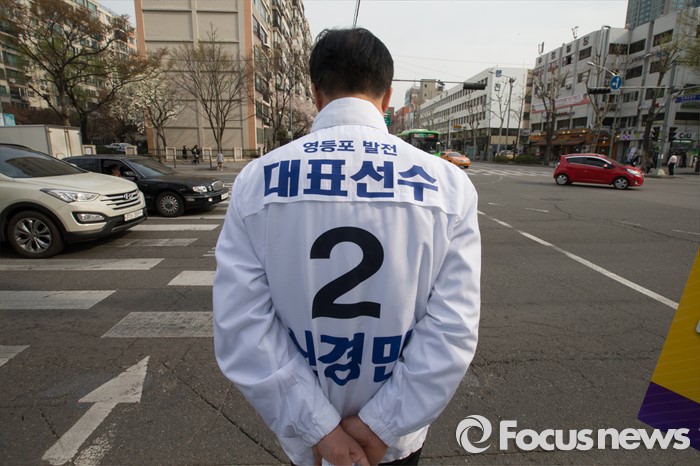 (서울=포커스뉴스) 6일 오후 서울 영등포구 한양아파트 사거리 일대에서 신경민 더불어민주당 영등포구을 후보자가 유세를 하고 있다.