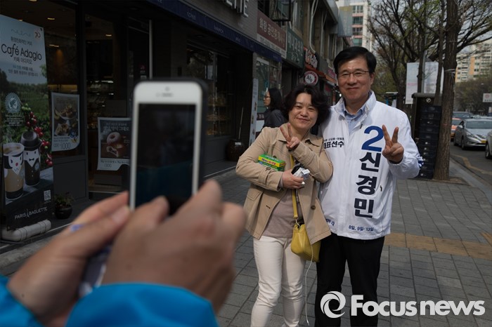 (서울=포커스뉴스) 6일 오후 서울 영등포구 한양아파트 사거리 일대에서 신경민 더불어민주당 영등포구을 후보자가 유세를 하고 있다.