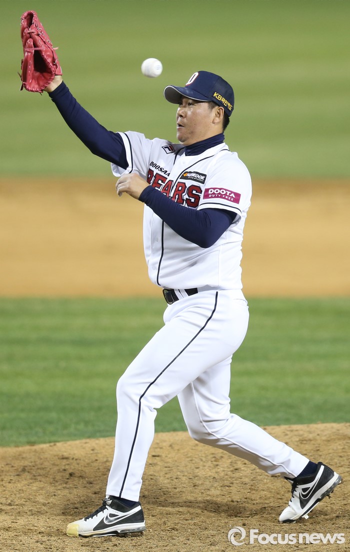 (서울=포커스뉴스) 6일 서울 잠실구장에서 열린 2016 프로야구 NC-두산 경기에서 9회말 2사후 두산 마무리 투수 이현승이 NC 마지막 타자 김종호의 타구를 잡으려다 놓치고 있다.