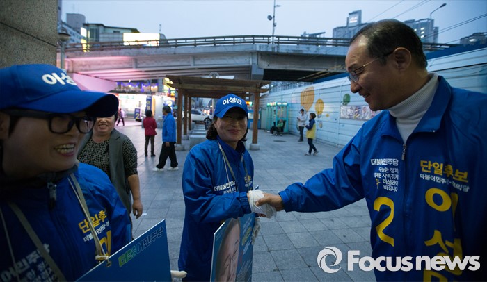 (인천=포커스뉴스) 제20대 총선에 출마한 이성만 더불어민주당 부평갑 후보가 6일 오후 인천 부평구 부개역 인근에서 선거운동원들과 악수하고 있다.