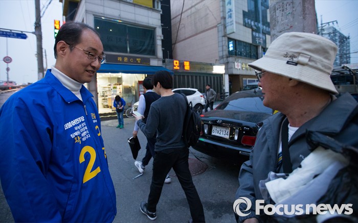 (인천=포커스뉴스) 제20대 총선에 출마한 이성만 더불어민주당 부평갑 후보가 6일 오후 인천 부평구 부개역 인근에서 선거운동을 하고 있다.