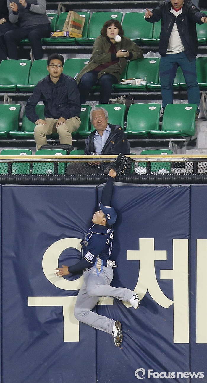 (서울=포커스뉴스) 6일 서울 잠실구장에서 열린 2016 프로야구 NC-두산 경기 6회말 1사후 NC 우익수 나성범이 두산 에반스의 홈런 타구를 잡으려 펜스를 타고 뛰어 오르고 있다.