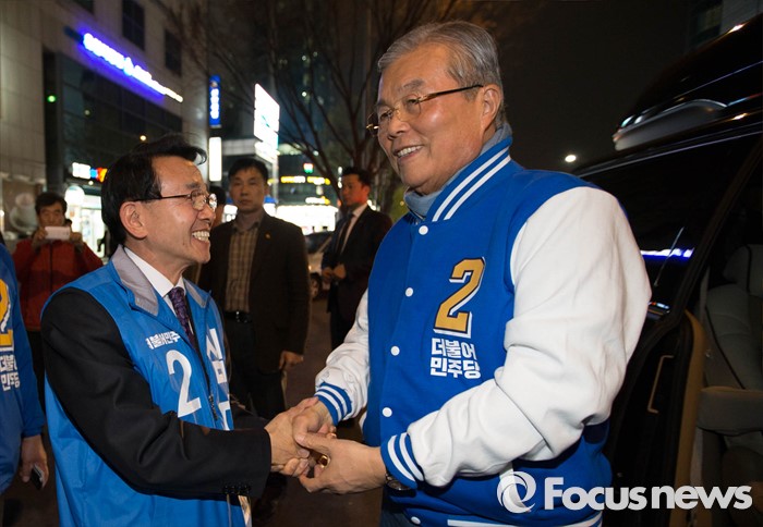 (서울=포커스뉴스) 김종인 더불어민주당 대표가 6일 오후 서울 강동구 이마트 앞에서 심재권 후보의 유세를 지원하며 심 후보와 악수를 하고 있다.