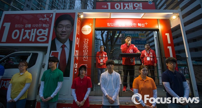 (서울=포커스뉴스) 6일 오후 서울 강동구 천호동 인근의 한 아파트 앞에서 이재영 새누리당 후보가 유세를 펼치고 있다.