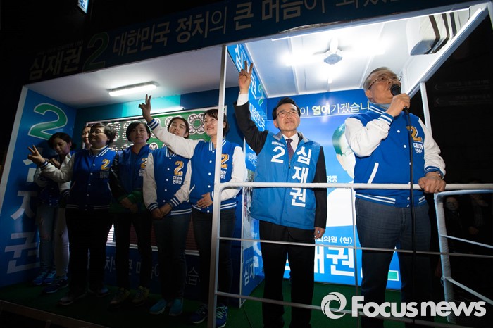 (서울=포커스뉴스) 6일 오후 서울 강동구 이마트 앞에서 김종인 더불어민주당 비대위 대표가 심재권 후보와 함께 유세를 펼치고 있다.