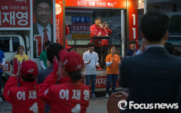 (서울=포커스뉴스) 6일 오후 서울 강동구 천호동 인근의 한 아파트 앞에서 이재영 새누리당 후보가 유세를 펼치고 있다.