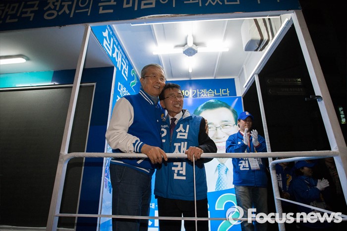 (서울=포커스뉴스) 6일 오후 서울 강동구 이마트 앞에서 김종인 더불어민주당 비대위 대표가 심재권 후보와 함께 유세를 펼치고 있다.