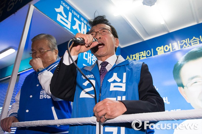 (서울=포커스뉴스) 6일 오후 서울 강동구 이마트 앞에서 김종인 더불어민주당 비대위 대표가 심재권 후보와 함께 유세를 펼치고 있다.
