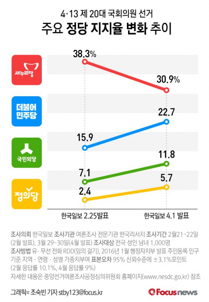선거가 시작되기 전 야권분열로 인해 개헌선인 180석까지 자신했던 새누리당은 공천파동 등 극심한 내분으로 지지율이 한층 떨어졌다.