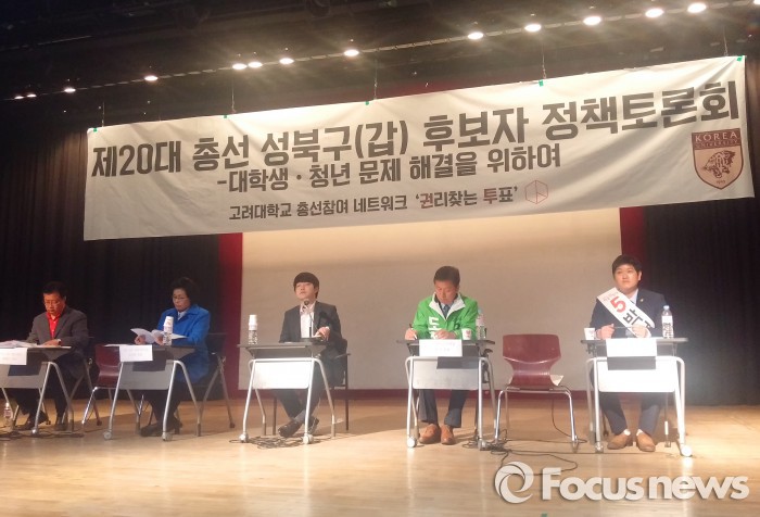 정태근 새누리당 후보, 유승희 더불어민주당 후보, 도천수 국민의당 후보, 민중연합당 박철우 후보 등은 6일 오후 6시 고려대학교 4·18기념관 대강당에서 열린 '성북갑 후보자 정책토론회'에 참석해 '청년·대학생 문제 해결'을 주제로 3시간여 동안 토론했다.