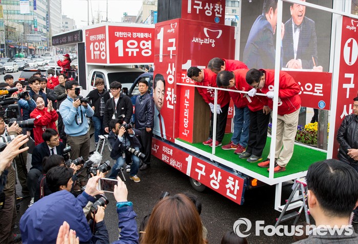 (서울=포커스뉴스) 7일 오전 서울 강서구 화곡역 사거리에서 강서구갑ㆍ을ㆍ병 후보 합동 지원유세에 나선 김무성 새누리당 대표가 후보들과 함께 유권자들에게 지지를 호소하고 있다.