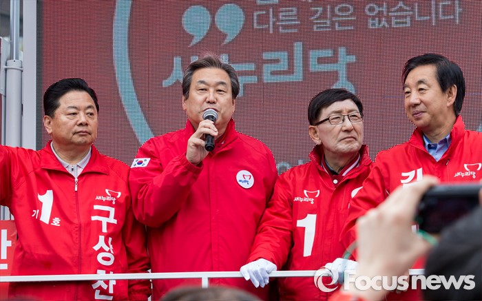(서울=포커스뉴스) 7일 오전 서울 강서구 화곡역 사거리에서 강서구갑ㆍ을ㆍ병 후보 합동 지원유세에 나선 김무성(왼쪽 두번째) 새누리당 대표가 후보들과 함께 유권자들에게 지지를 호소하고 있다.
