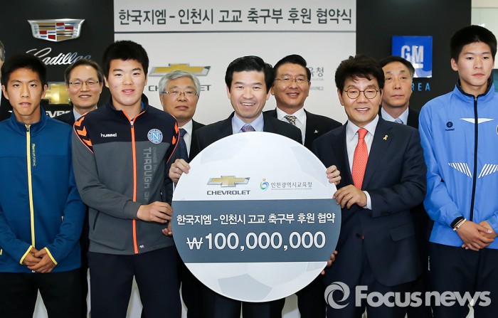 (서울=포커스뉴스) 한국GM은 6일 부평 본사 홍보관에서 인천시 교육청과 공동으로 인천 지역 내 5개 고등학교 축구부와 후원 협약식을 가졌다고 7일 밝혔다.