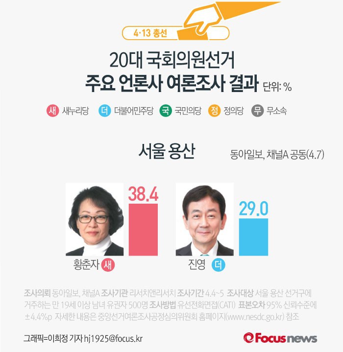 (서울=포커스뉴스) 동아일보와 채널A가 리서치앤리서치에 의뢰해 7일 발표한 서울 용산 여론조사 결과에 따르면 새누리당 황춘자 후보의 지지율은 38.4%, 더불어민주당 진영 후보는 29.0%를 기록했다.