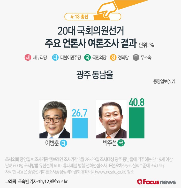 (서울=포커스뉴스) 중앙일보가 여론조사기관 엠브레인에 의뢰해 7일 발표한 결과에 따르면 광주 동남을에서 더민주 이병훈 후보의 지지율은 26.7%, 국민의당 박주선 후보의 지지율은 40.8%인 것으로 나타났다.