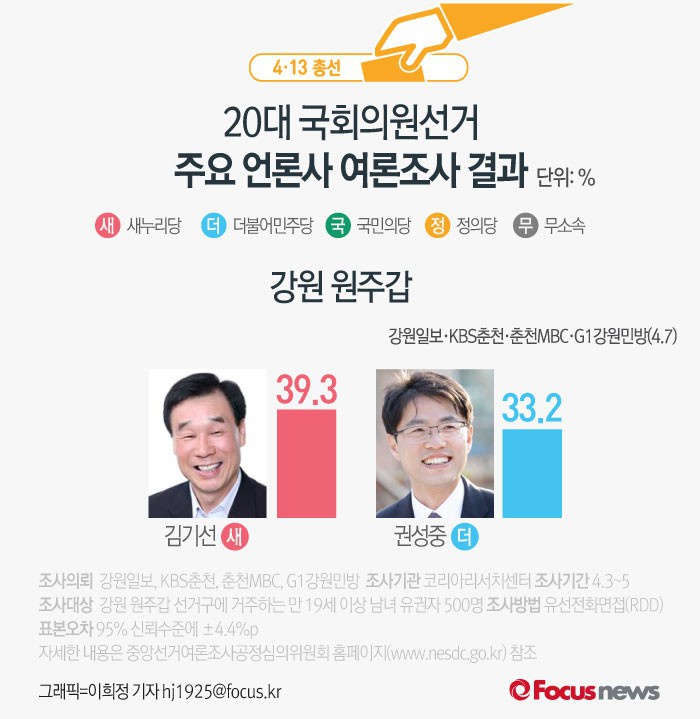 (서울=포커스뉴스) KBS춘천, 춘천MBC, G1강원민방, 강원일보가 공동으로 코리아리서치에 의뢰해 7일 발표한 강원 원주갑 여론조사 결과에 따르면 새누리당 김기선 후보의 지지율은 39.3%, 더불어민주당 권성중 후보의 지지율은 33.2%로 나타났다.
