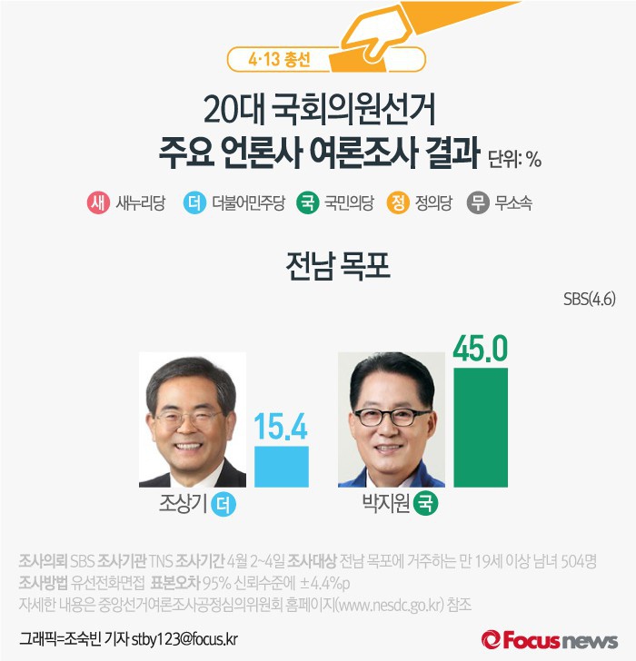 (서울=포커스뉴스) SBS가 여론조사기관 TNS에 의뢰해 6일 발표한 결과에 따르면 전남 목포에서 국민의당 박지원 후보가 45.0%, 뒤이어 조상기 더불어민주당 후보가 15.4%의 지지율을 얻은 것으로 나타났다.