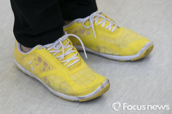 (서울=포커스뉴스) 심상정 정의당 대표가 7일 오전 서울 여의도 국회에서 노란 운동화를 신고 총선전략 기자회견을 하고 있다.