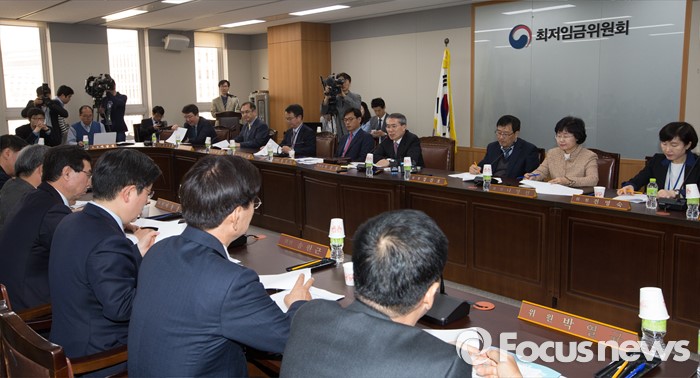 (세종=포커스뉴스) 7일 오전 세종시 정부세종청사 고용노동부 최저임금위원회 대회의실에서 열린 제1차 전원회의에서 박준성 위원장이 회의를 주재하고 있다.