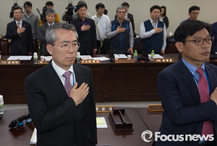 (세종=포커스뉴스) 7일 오전 세종시 정부세종청사 고용노동부 최저임금위원회 대회의실에서 열린 제1차 전원회의에서 박준성 위원장과 위원들이 국기에 대한 경례를 하고 있다.