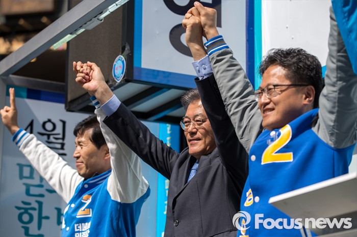 (군포=포커스뉴스) 문재인 더불어민주당 전 대표가 7일 오전 경기도 군포시 산본중심상가를 방문해 이학영 군포시을 후보, 김정우 군포시갑 후보와 함께 유권자들에게 한 표를 호소 하고 있다.