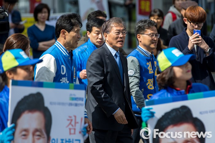 (군포=포커스뉴스) 문재인 더불어민주당 전 대표가 7일 오전 경기도 군포시 산본중심상가를 방문해 이학영 군포시을 후보, 김정우 군포시갑 후보와 함께 유권자들에게 한 표를 호소 하고 있다.