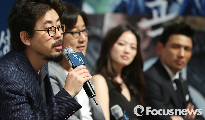 (서울-포커스뉴스) 7일 오전 서울 강남구 압구정 CGV에서 열린 영화 '곡성' 제작보고회에 참석한 나홍진 감독이 취재진의 질문에 답하고 있다. 왼쪽부터 나홍진 감독, 배우 곽도원, 천우희, 황정민.