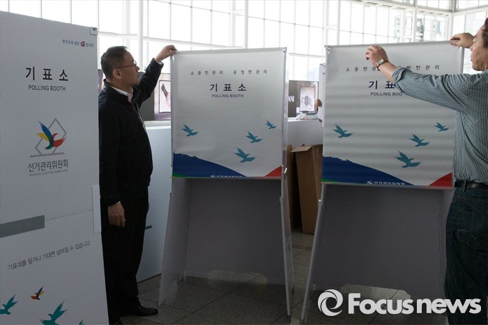 (서울=포커스뉴스) 20대 총선을 6일 앞둔 7일 오전 서울 용산구 서울역 3층 맞이방에 사전투표소가 설치되고 있다.