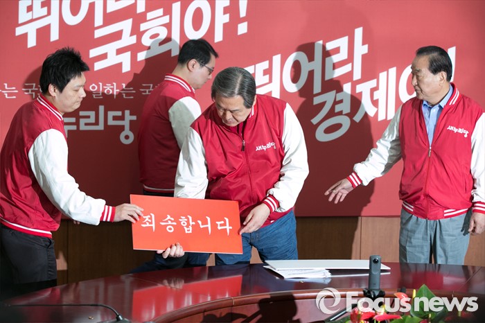 (서울=포커스뉴스) 김무성(오른쪽 두번째) 새누리당 대표가 7일 오전 서울 여의도 당사에서 열린 공동선대위원장 긴급회의에 참석해, 투표독려 홍보문구를 보고 있다. 오른쪽은 서청원 최고위원.